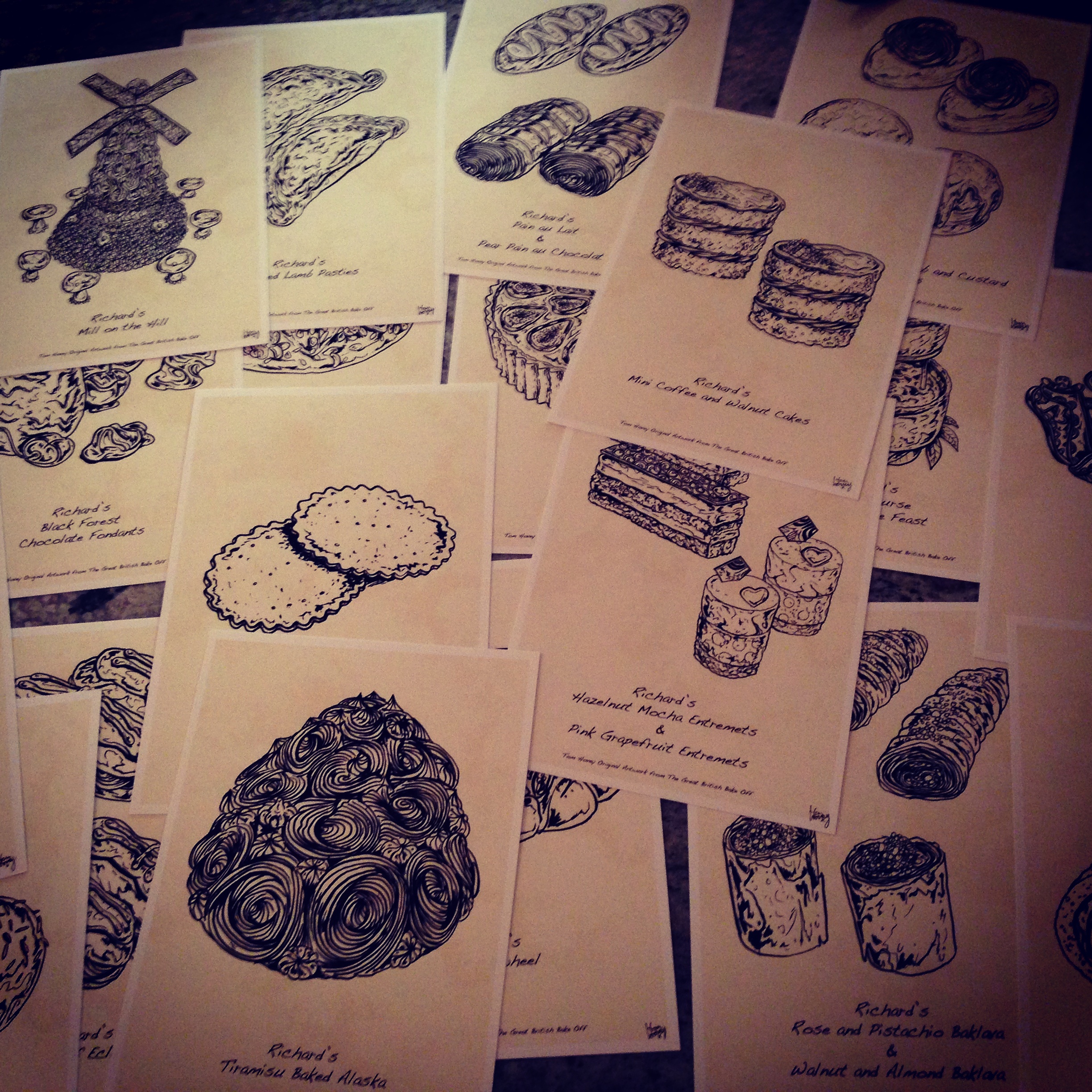 One of the people I had the pleasure of meeting during the Great British Bake Off was Tom Hovey, who draws all the pictures of the bakes for the show. Sarah bought me all 20 of the pictures of my bakes – my Signature and Showstopper bakes from all 10 episodes – which arrived this week. I’m going to frame them all and hang them in my kitchen so I’ll always have a reminder of the incredible experience I had this year. If you want any prints from this year’s series, get in touch with Tom.