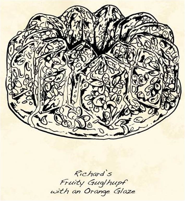 This time a year ago, I was staying with my inlaws for the Easter holidays and practising all my recipes for the Great British Bake Off. My friend Dawn lent me her bundt tin for the Guglhupf I made in week six, pictured in Tom Hovey‘s drawing above. I was reluctant to buy my own tin as I never thought I’d make it that far through the competition, so didn’t want to jinx it by buying a bundt tin! I can be  a bit superstitious about things like this in both my hobbies; baking and fishing. If you bring a fully stocked ice bucket fishing you are guaranteed not catch a thing! Fast-forward a year and I now have a few bundt tins knocking about in my kitchen as for one thing, they’re useful for making monkey bread. There’s a monkey bread recipe in my forthcoming book – it’s a real favourite of mine and the kids. I’m enjoying playing with different cake ideas for bundt tins as they need a bit of tweaking from standard cake recipes due to the depth of the tins.