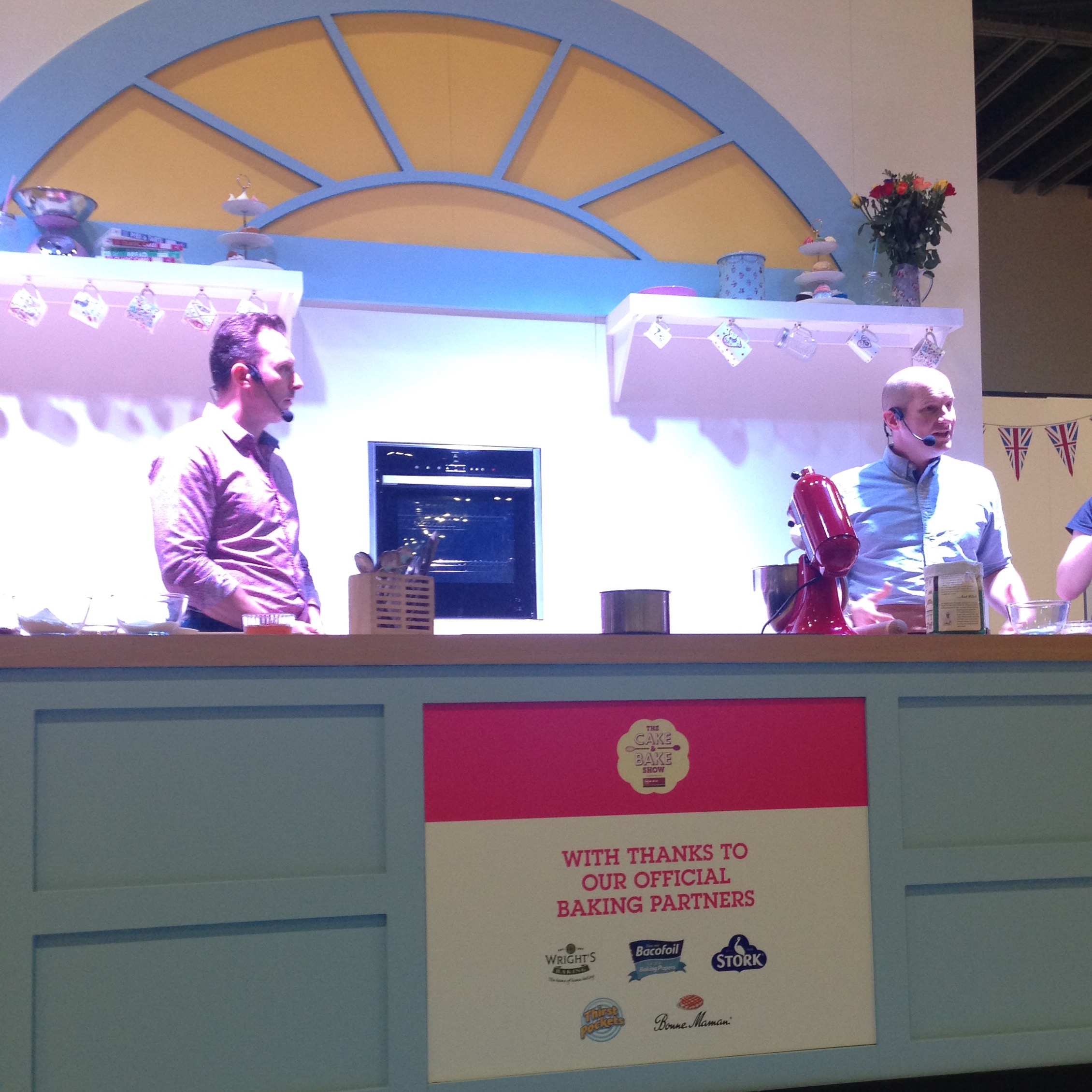 A year ago, I went along to the Cake & Bake Show like a bit of a rabbit in headlights. I think it was the week before my own final and I was a bit daunted as to what might happen next. Rosemary Shrager invited me up to join her during her demo and the idea of presenting on my own in front of hundreds of people, like I did today with Andrew Dickens (above), was so alien to me. My first blog post was all about not knowing what might happen after the Bake Off final and I could have never imagined how much has changed for me in 12 months. Writing my book has been a thrill and this afternoon, the Great British Bake Off Class of 2014 programme was on BBC1, providing a real trip down memory lane not just for me but for my 11 baking friends.