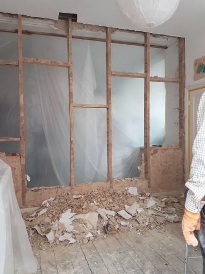 I’m taking a bit of time off from building for other people and concentrating on my own home for the next few months. I’ve been meaning to do this for ages as even though my kitchen is only seven years old, since then, we’ve had two more kids and a dog, and the amount of baking gear I’ve got since Bake Off means we have outgrown it. So this week I knocked down the wall between my kitchen and study (that in reality had become the junk room). Don’t try this at home unless you’ve had a structural engineer give you the ok! My house is over 100 years old, and as a bricklayer by trade I get a bit misty eyed looking at work done by my equivalents back in the day. I’ll be reusing a lot of the bricks I removed in the rest of my renovations as there’s still a bit more knocking through and bricking up to do, and I really like to recycle as much from this house as possible. The knocked-through kitchen is in the picture at the top of this post – it’s going to be a great space.