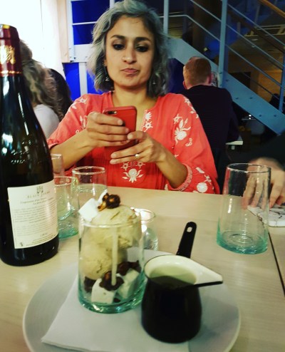 On Friday night Sarah and I had a great night out at Honey & Smoke with my Bake Off mates Chetna, Iain, Martha, Kate and their other halves. It felt like ages since we’d had a proper catch-up and we all had so much to talk about. I love spending time with these guys – they’re such good friends and all so interesting. I feel really lucky to have them all in my life. You do find it’s a bit of an Instagram-fest when the food comes out though – I keep laughing at the picture above of Chetna and me both Instagramming my pudding!