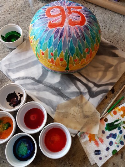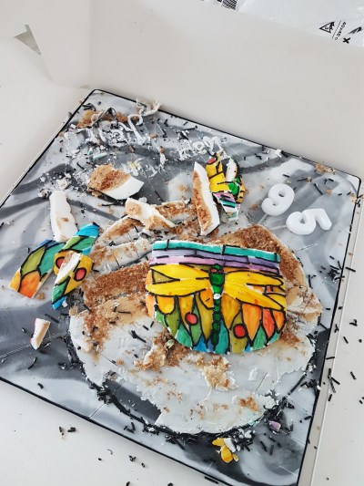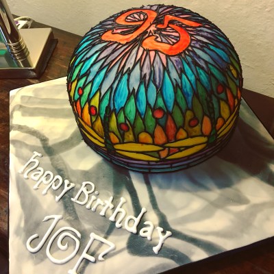 I had in mind wanting to make a Tiffany lamp cake and looked through loads of designs from c.1923 when he was born. I settled on a dragonfly design and made four 10 inch coffee and walnut cakes (Joe’s favourite) based on my usual recipe but including chopped walnut pieces in the sponge as there were none going on top. I sandwiched the four sponges together with coffee buttercream and then carved it into a dome shape with a serrated knife. I crumb-coated the cake with buttercream and covered it in Renshaw fondant. I then drew a dragonfly template onto baking parchment and using a needle, pricked the outlines of dragonflies around the bottom of the cake. I drew the ’95’ in Art Nouveau lettering on the top of the cake and then painted it all freehand using my Wilton food colouring gels mixed with a tiny bit of water (roughly a pea-sized drop of gel mixed with about three drops of water).