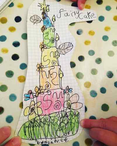 Anyway, back to cakes! This week was our middle daughter’s 6th birthday and being a creative soul with a very definite view of what she wants in life, she drew the picture above of her ‘Dream Cake’. Obviously over the past few years the kids’ expectations for birthday cakes have risen, so I had to do my best to live up to it! I ran out of time to make the two fairy versions of her and her best friend on the drawing above but I think I made a pretty fair interpretation.