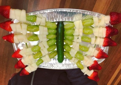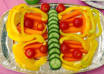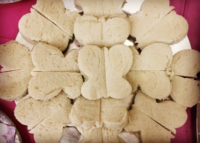 For scale, you can see me holding the cake above. It wasn’t too big to carry and while the top four layers went to party guests and their families, we’ve been enjoying the bottom two layers with our extended family this weekend. I also used cake lace for the first time. The party was butterfly themed so Child #2 had picked out this cake lace kit in Morrison’s the other day and it was really easy to use – definitely something I’d do again. We continued the butterfly theme with the rest of the party food, as you can see below. The sandwich cutters were from here.