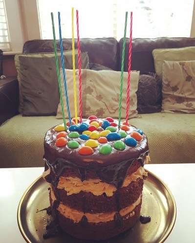 I found Richard’s recipe really easy to follow but there were a few things that there was no way I was going to do. The first was being able to horizontally cut two sponges evenly to make four layers. That would have been a disaster. The second was being able to coat the cake in buttercream and ganache without it looking a dog’s dinner. Instead I used the quantities in his recipe for the sponge but split them between three six-inch cake tins. Also, there was no smooth peanut butter in the cupboard so I substituted all of it for crunchy peanut butter and actually, I think it worked much better in both the sponge and the buttercream (if I do say so myself). I knew I wasn’t coating the cake in ganache so I reduced it to 200g dark chocolate and 200ml double cream, but still had loads left over so I think 100 of each would be fine. The ganache split twice, but I used the tip in Richard’s recipe to rescue it both times – phew. And I used peanut M&Ms on top, because they’re the best and matched the candles. From start to finish it was one of the quickest cakes I’ve ever made and while I can’t make things look like Richard does, the height of it gave it a bit of drama.