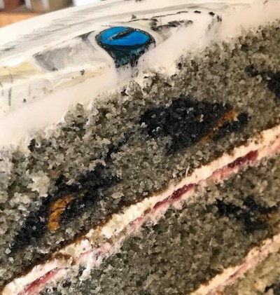 This is one of those times I’m very grateful that my parents live across the road from me as I can use their kitchen while mine is out of action and there are no toddlers at their house in danger of getting their mitts on my bakes! I can plug myself into a TV series (currently Westworld) and get lost in painting. I’ve been going to weekly art classes since last year after getting the ‘Big Painting Challenge‘ bug and it’s really helped with my cake painting techniques too. I used black, sky blue and ivory Wilton gel colours to paint the cake, plus this silver paint for highlighting and diluted the colours with water to get the different shades.