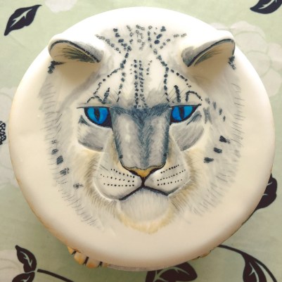 As you might have seen on my Instagram story this weekend, I made a special birthday cake for our friends’ son Freddie. Freddie loves snow leopards, as do I. They’re incredibly endangered and one of the reasons I admire the work of the Zoological Society of London (ZSL) so much is because of the conservation work they fund for endangered animals across the world, including leopards. Once I had decorated the cake with fondant, I made fondant ears and paws then marked out the face of a snow leopard on top of the cake, above. My technique for marking out involved cutting a piece of baking parchment to the same size as the top of the cake. I then drew the outline of the snow leopard in freehand in pencil on the baking parchment – this is why a pencil behind the ear comes in so handy when you’re a baker! Once I’d drawn the leopard’s face, I put the baking parchment onto the top of the cake and traced over the pattern again in pencil. The indentation of this onto the baking parchment make the markings you can see in the picture above.