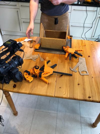 When the gingerbread had cooled, Triton’s gear came into play. I set the toolbox pieces in a massive Triton vice and set to smoothing off the edges. For this I used an orbital sander, like all bakers should! Seriously – the fine, straight edge an orbital sander gives to a piece of gingerbread is astonishing! If I’d had one of those in the tent I would have been a happy man. I used the Triton orbital sander again at work today to sand some oak worktops and I can assure you the saw dust wasn’t as tasty this time around. The sides of the toolbox were designed to slot together so with my gingerbread still clamped I used my sharp chisels to tidy up the interlocking parts.