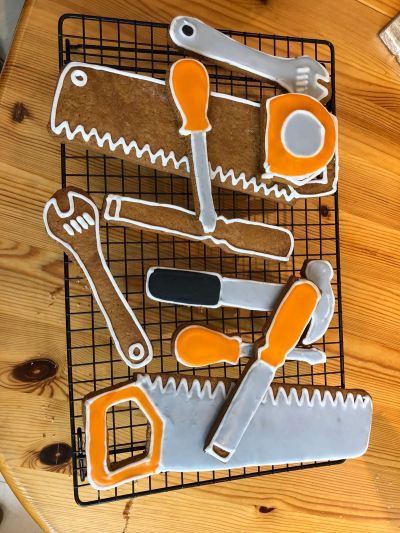 Once I had built the body of the box I reinforced it with a little royal icing – mixed up using my balloon whisk and drill combo again – and left it to set while I decorated my gingerbread tools. The easiest way to decorate gingerbread (or any biscuits) is using the flooding technique. To do this, I pipe the outline of each tool, along with a little detail and leave the icing to dry for 10 minutes – the exact time it takes to make and drink another cup of tea. Once the icing had set, I flooded the biscuits. I made some more icing and coloured it. This icing needs to be a looser mix that will flow when piped. I piped this directly on to the gingerbread tools and it sets with a smooth glossy surface. With the edible tools now set aside to dry I could crack on with my toolbox.